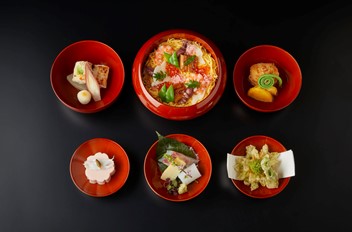 「桜会席弁当」は、天麩羅、焼物、お造り、煮物などのお料理の数々を大中小の応量器に彩り豊かに盛り付け期間限定でご提供するランチメニューです。季節の食材を使用したお料理からちらし寿司、デザートまでお愉しみいただけます。