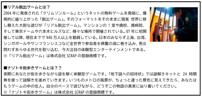 3年振りとなる今回は、過去6回の開催で述べ38万人以上が参加したナゾトキ街歩きゲーム「地下謎への招待状」の原点となる2014年復刻版として再演します。「謎」を一部リニューアルして、はじめて地下謎に挑戦される方はより楽しみやすく、再チャレンジされる方にもお楽しみいただけます。「地下謎への招待状2014REVIVAL」は、東京メトロの駅や東京という街全体を舞台に、専用24時間券と謎解きキットを使って、参加者自らがプレイヤーとなって街を歩き、東京や東京メトロに隠された謎を解き明かしながらゴールを目指す体験型ゲームです。