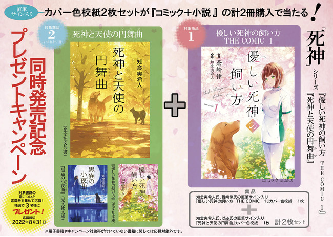 『死神と天使の円舞曲』と『優しい死神の飼い方 THE COMIC 1』(原作者:知念実希人氏、イラストレーター:げみ氏、漫画家:蒼崎律氏)の直筆サイン入りカバー色校紙をセットでプレゼントいたします。