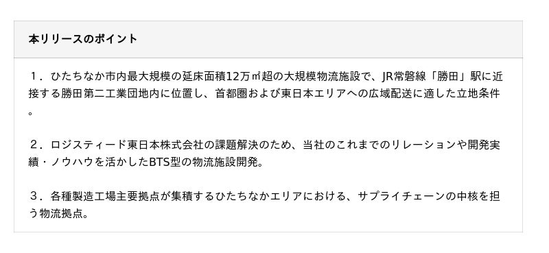 三井不動産株式会社(本社:東京都中央区、代表取締役社長:植田 俊、以下「三井不動産」)は、茨城県ひたちなか市において、ロジスティード東日本株式会社(以下「ロジスティード東日本」)をテナントとするBTS(Build To Suit)型物流施設「(仮称)水戸ロジセンター」(以下「本施設」)を、2026年2月2日に着工しましたのでお知らせします。