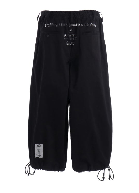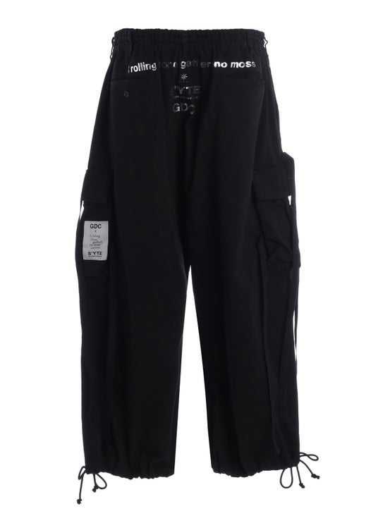 U.S.ミリタリーM-65とU.K.発祥のテクノパンツをベースに、無骨さと美しさを併せ持つワイドフォルムへ再構築した一本。ウエストと裾はドローコードで調整可能。素材には厚手のコットンドリルを採用し、製品洗いによって柔らかな風合いと表情を引き出している。プリントにはシリーズ共通の漆表現を踏襲しつつ、手作業ならではの濃淡や褪色感を残し、クラフト感のある仕上がりに。