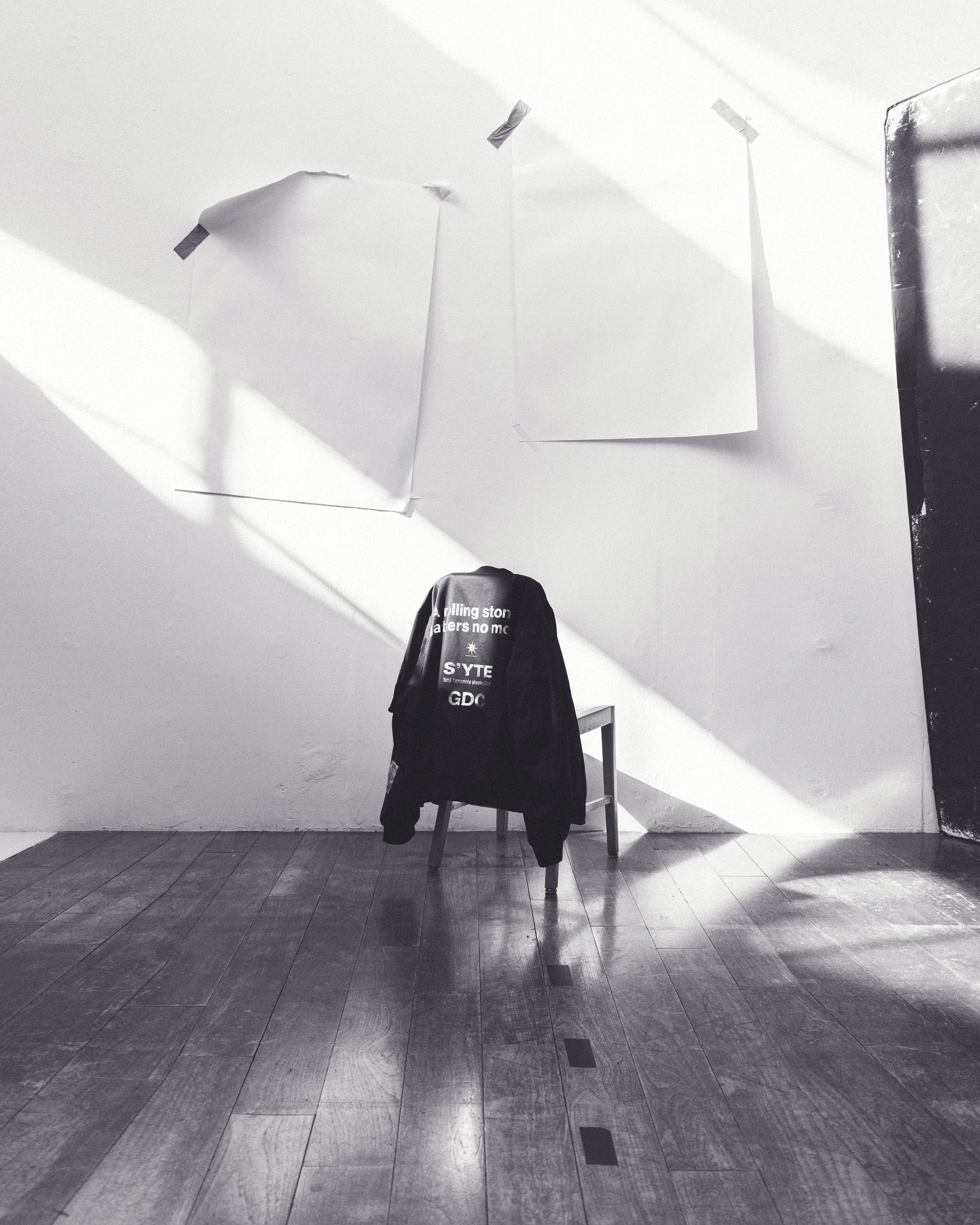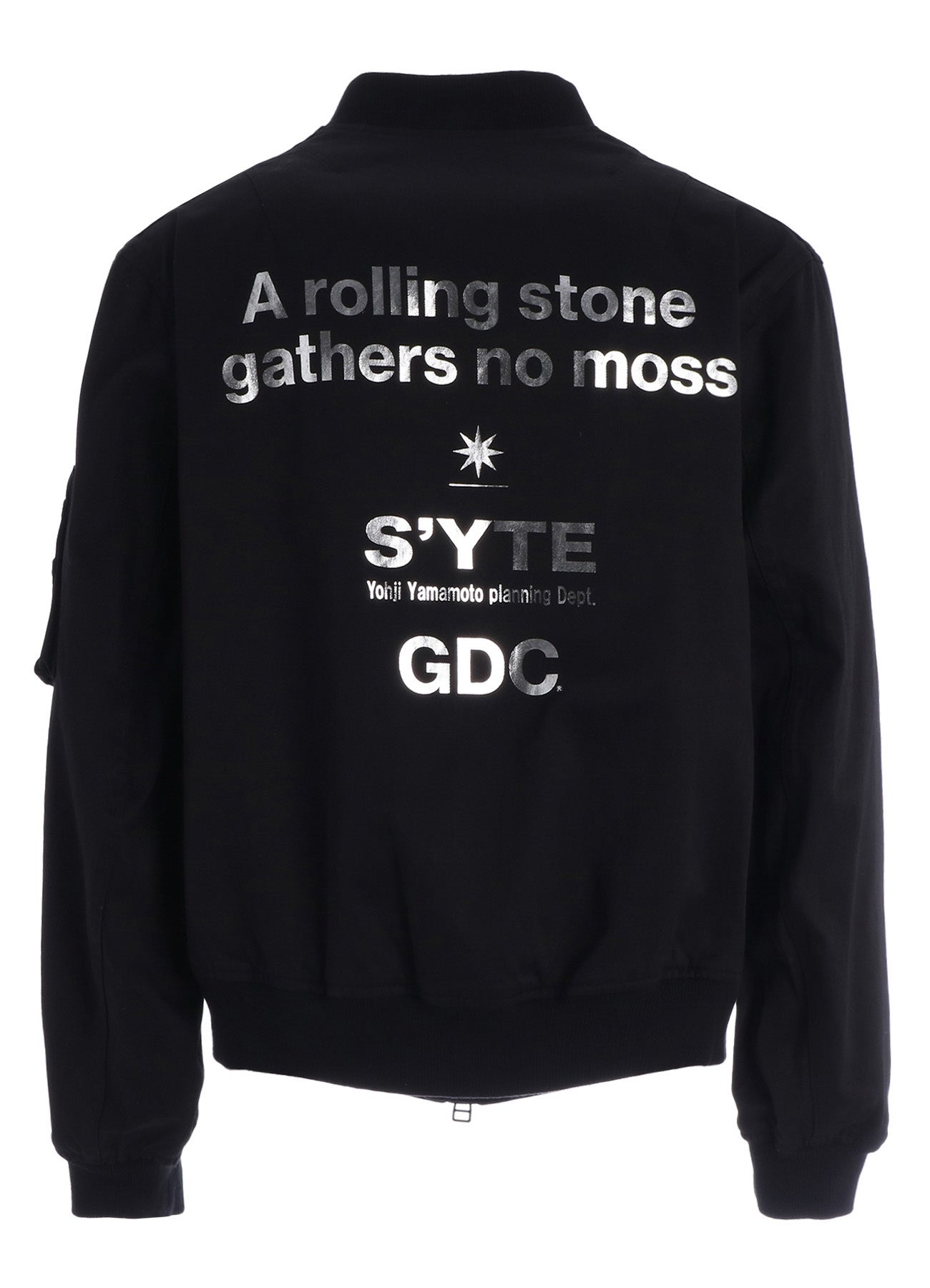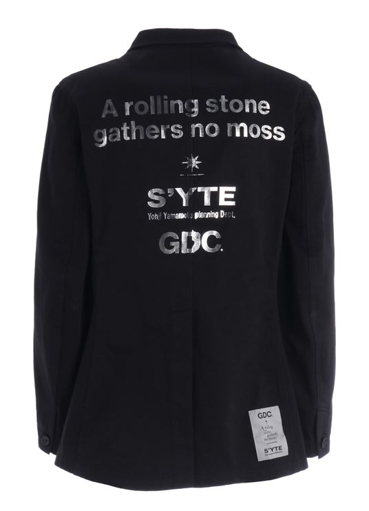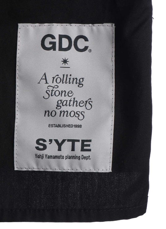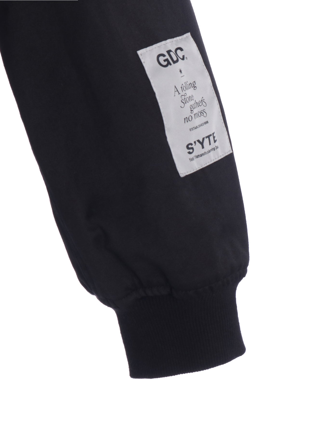 本コラボレーションでは、全てのアイテムにシルバー箔でS’YTE×GDCのロゴと、GDCの哲学を象徴する一節「A rolling stone gathers no moss」をプリント。その存在感と、派手すぎない上品な光沢が特徴。使用していくうちに箔がひび割れ、剝がれていく様子からは儚さや退廃美を感じさせられる。また同じく全てのアイテムに「A rolling stone gathers no moss」と記したグレーのネームタグを配置。本来見えることのないネームをあえて見える位置に配置することで、その反骨精神をデザインに落とし込んでいる。