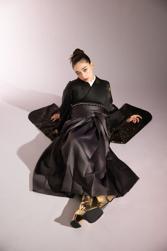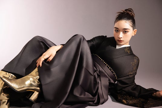 今回の新ビジュアルでは、職人の手により丁寧に黒染めされ金彩だけが浮き出た振袖に、メタリックゴールドのアクセントを加えたスタイリングを採用。光沢感のあるヴィーガンレザー袴と組み合わせることで、洗練されたハンサムクールな印象を演出しています。