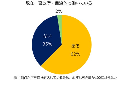 1:62%が「官公庁・自治体への転職に興味がある」と回答。興味をもつ理由の上位は「安定した収入」「仕事を通じた社会貢献」。(図1~5)
