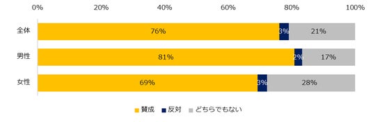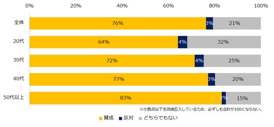 官公庁・自治体で、公務員資格取得者以外の外部人材を登用することについての賛否を伺うと、76%が「賛成」と回答。男女別・年代別でも過半数が「賛成」と回答しました。