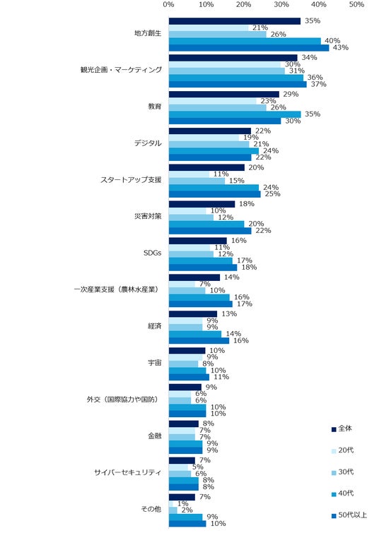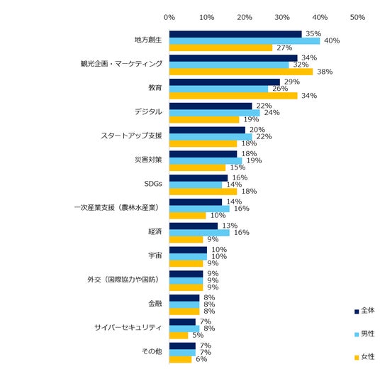 男女別で見ると、男性の興味がある分野トップ3は、1位「地方創生」(40%)、2位「観光企画・マーケティング」(32%)、3位「教育」(26%)。女性の興味がある分野トップ3は、1位「観光企画・マーケティング」(38%)、2位「教育」(34%)、3位「地方創生」(27%)でした。
