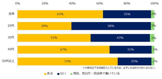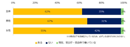 「官公庁・自治体への転職に興味はありますか?」と伺ったところ、62%が「ある」と回答しました。男女別では、女性よりも男性のほうが12ポイント関心が高いことがわかりました(男性:67%、女性:55%)。年代別でみると、20代:39%、30代:53%、40代:67%、50代以上:73%と、年代が上がるほど関心のある人が増加する傾向にあることがわかります。