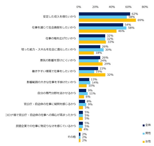 ★ 62%が「官公庁・自治体への転職に興味がある」と回答。興味をもつ理由の上位は「安定した収入」「仕事を通じた社会貢献」。