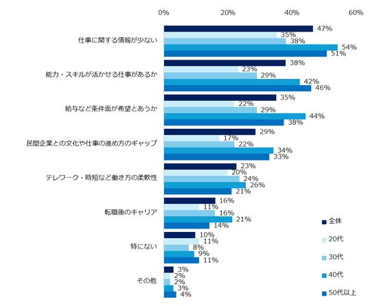 官公庁・自治体への転職を考えた際の、不明な点・不安な点を伺うと、トップは「仕事に関する情報が少ない」(47%)でした。次いで、「能力・スキルが活かせる仕事があるか」(38%)、「給与など条件面が希望とあうか」(35%)が続きます。男女別では、「テレワーク・時短など働き方の柔軟性」(男性:17%、女性:32%)で15ポイントの差がひらきました。不明・不安に感じる具体的な理由についても紹介します。
