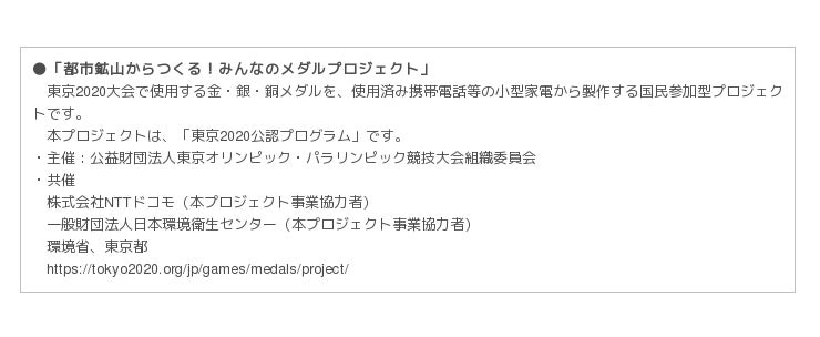 大和ハウス工業株式会社(本社:大阪市、社長:芳井敬一)は、公益財団法人東京オリンピック・パラリンピック競技大会組織委員会が実施している「都市鉱山からつくる!みんなのメダルプロジェクト」に参画し、当社社員(16,275名)(※1)より、使用していない携帯電話の寄付を募り(※2)、同プロジェクトへ提供します。