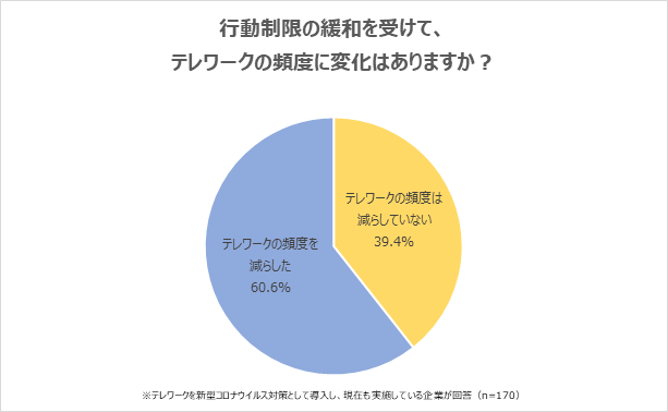 行動制限の緩和を受けて、「テレワークの頻度を減らした」と回答した企業が60.6%に上りました。「テレワークだけでは業務に支障があるので、出社の機会も設けている」「ブレストや会議は出社して実施している」「業務に合わせて生産性の高い働き方を選択するようにしている」「職種によって、頻度を調整している」といった声が寄せられました。