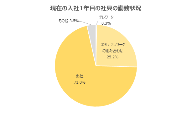 現在の入社1年目の勤務状況は「出社」が71.0%で最多となりました。次いで、「出社とテレワークの組み合わせ」25.2%が続きます。「テレワークのみ」の回答は0.3%に留まりました。
