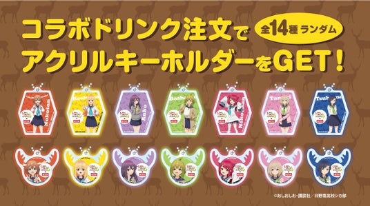 ビッグエコー4店舗では、4人のメインキャラクターをイメージしたコラボドリンク4種を販売。1杯の注文ごとに、ここでしか入手することができない14種のオリジナルアクリルキーホルダーの中から、ランダムで1個プレゼントします。