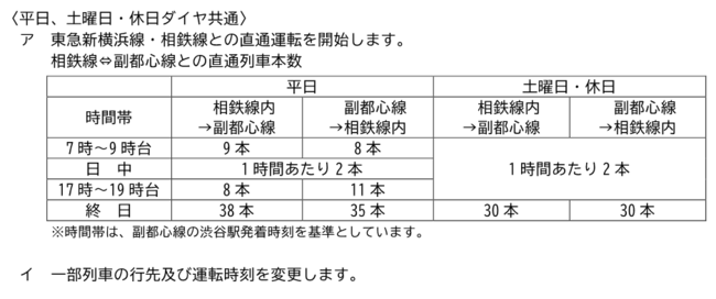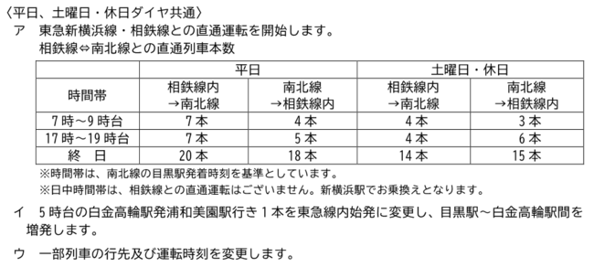 東急新横浜線・相鉄線との直通運転を開始いたします。また、5時台に目黒駅~白金高輪駅間1本増発します。