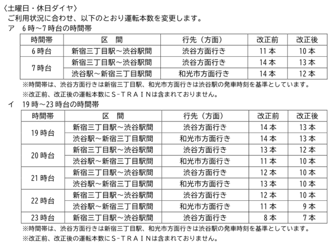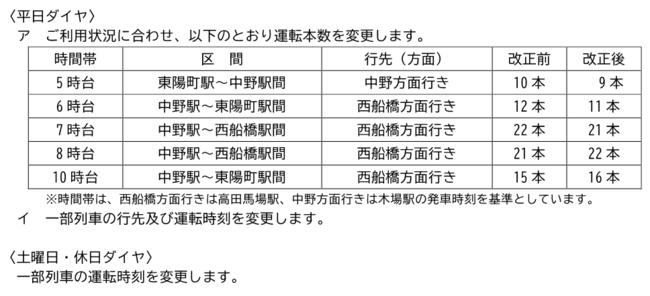 ご利用状況に合わせ、平日5時~9時台、21時~23時台、土曜日・休日6時~7時台、19時~23時台の運転本数を変更します。