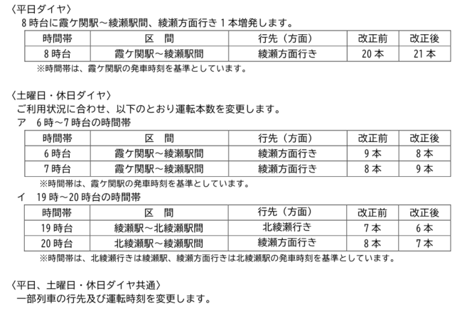 平日8時台に霞ケ関駅発綾瀬方面行き1本増発します。また、ご利用状況に合わせ、土曜日・休日6時~7時台、