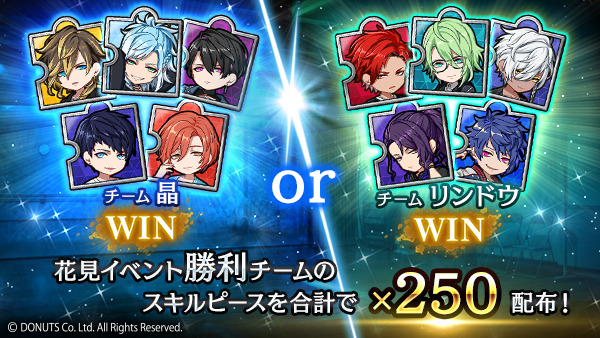 花見衣装のチーム晶 VS チームリンドウによるドラフトチーム花見対決イベントです。イベント終了後、勝利チームメンバーのスキルピース合計250個が配布されます。