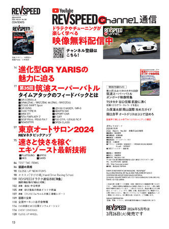 誌面特集は『第35回 筑波スーパーバトル 出走71台 詳細ガイド』と『東京オートサロン2024 チューニング最前線』、『マフラー/エキマニ/キャタライザー最新技術』の3本です。CLUB RH9鈴鹿走行会や各種パーツ/アイテムのレポートも掲載。入りきれなかった記事は公式WEB『revspeed.jp』に順次アップ予定です。