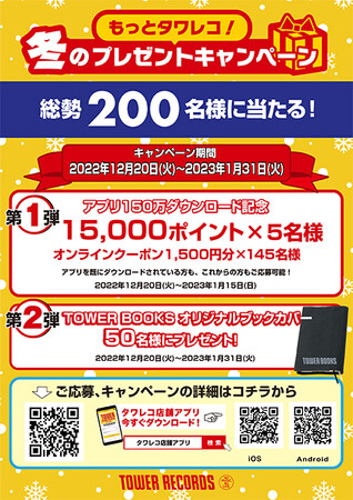 タワーレコード株式会社(本店所在地:東京都渋谷区、代表取締役社長:嶺脇育夫、以下タワーレコード)は、公式アプリ「タワレコ店舗アプリ」が2022年10月に150万ダウンロードを達成したことを記念して、12月20日(火)から2023年1月31日(火)にかけて、『もっとタワレコ!冬のプレゼントキャンペーン』を開催します。