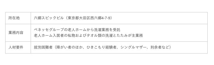 事業内容は、グループ内で介護事業を展開するベネッセスタイルケアの老人ホームのご入居者の方々の私物やバスタオルの洗濯です。従来、雇用の難しかった障がいの重い方々を雇用するため、各老人ホーム内で行っていた洗濯業務を集約し「大型洗濯センター」として事業化しました。