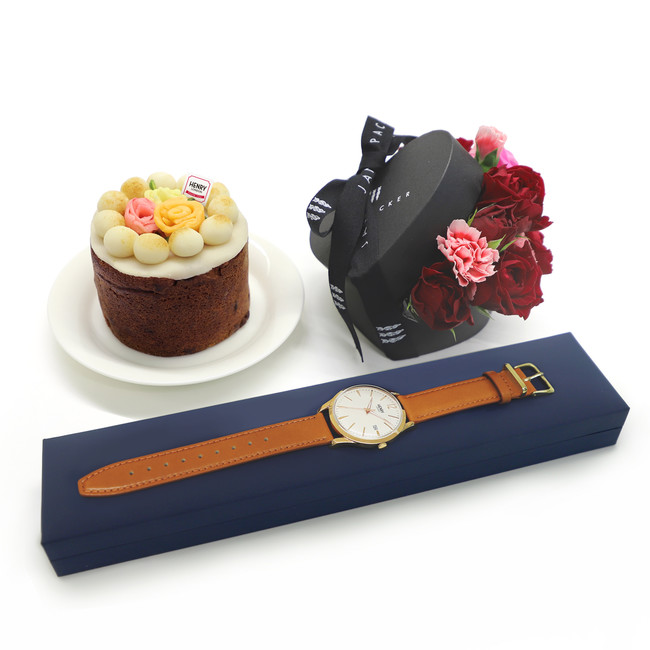 母の日セレクション腕時計4種の中から腕時計をひとつお選びいただき、『ジェーンパッカー×ヘンリーロンドンオリジナルフラワーアレンジメント』と『ベリーズティールーム×ヘンリーロンドンオリジナルシムネルケーキ』をセットにして販売いたします。5月8日(日)母の日にお届けします。