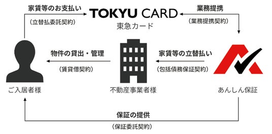 本サービスは、東急カードが東急線沿線での長年のクレジットカード事業で培った実績やノウハウを活かし、あんしん保証が掲げる「連帯保証人制度に代わる機関保証の普及の実現」に向けて、2社が共同で提供する家賃債務保証サービスです。本サービスの利用により、入居者は連帯保証人を探す必要がなくなり、不動産事業者は賃貸借契約にかかる賃料などの全額を事前に立替払金として収受するため、賃貸借契約の円滑化と賃料収受の安定化を実現することができます。