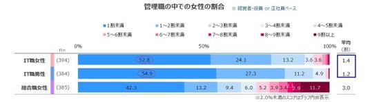 管理職における女性割合も、総合職では平均3割に対してIT職では1割強と、IT職の方が所属する部門における女性管理職の割合は低く、男女ともに「1割未満」が半数を超えています。