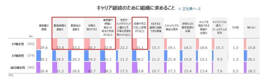 さらに、IT職の女性がキャリア継続のために組織に求めることの上位は、「休暇の取りやすさ」「勤務地/勤務時間の柔軟さ」「業務量や時間に見合った給与」「正しく評価されること」でした。