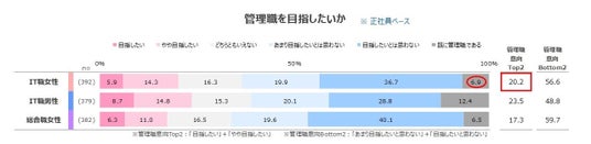 調査に回答いただいたIT職の女性のうち、「既に管理職である」人が6.9%おり、管理職を目指したいと答えた人は非管理職のうちの20.2%でした。