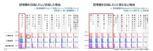 管理職を目指したい/目指した理由は職種・性別に関わらず「給料が上がる」が最多であり、IT職の女性では次いで「キャリアを進展させられる」の回答が多くみられました。