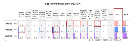 男女差が出た項目については、IT職の女性は「昇進・昇格しにくい」「家庭やプライベートとの両立が難しい」「評価されにくい」が上位で、IT職の男性では「精神的な負荷が高い」「業務量が多い/配慮されにくい」が上位となり性別による違いがみられました。