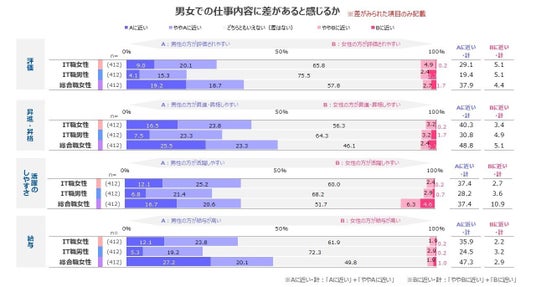 一方で、IT職の女性は「給与」、「評価」、「昇進・昇格」、「活躍のしやすさ」の項目で「男性の方が優位であると感じる」と回答した人が多い結果となり、これは総合職の女性でも同様の傾向がみられました。