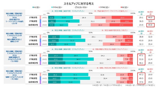 スキルアップに対する考えは、職種・性別に関わらず、転職や異動と比較すると「現在の職種(業務内容)でスキルアップしたい」割合が大きい結果でした。一方で、IT職の女性・総合職の女性では、はたらき方やワークライフバランスを優先する意向も強く、ワークライフバランスを取りながら現職でスキルアップしたい傾向がうかがえます。