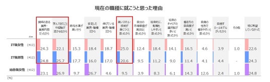 ・IT職の女性が現在の職種を選んだ理由は、「高いスキル・技術が身につくと思ったから」(25.0%)、「興味のある業界・業務内容だったから」(24.3%)、「学んできたことや経験が活かせるから」(22.1%)が上位でした。