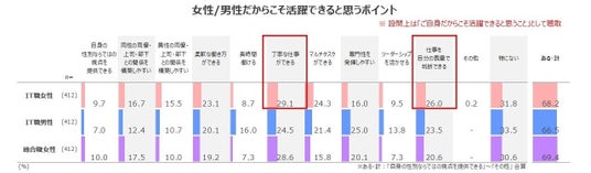 また、自身がこの仕事で活躍できると思うポイントについての質問では、IT職の女性は「丁寧な仕事ができる」「仕事を自分の裁量で判断できる」などが上位でした。