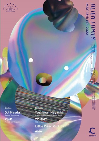 ALIEN FAMILYは、総合的なキュレーションも徹底されており、Contactフロアでも、このパーティと絶妙な相性を期待させる鬼才Yoshinori Hayashiや、TECHNIQUEバイヤーでありエキスパートTommyなど隙がない。さらに、昨今サイケデリックなまでの音楽の深化を進めるLittle Dead Girlや、テクノロジカルでオブスキュアながらも暖色のエレクトロニクスを展開するAkieなど、強いオリジナリティをもつ音楽巧者がALIEN FAMILYの理想を形作る。