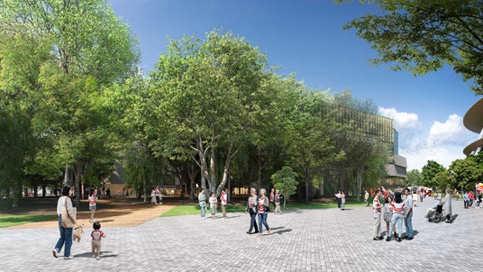 また、敷地内の存置樹木を最大限保存するほか、外苑創建時に植樹された樹種から敷地内に植樹する新植樹を選定し、神宮外苑地区の良好な緑地の形成を図ります。また北側には日本スポーツの歴史や価値を発信する博物館機能を設け、周辺の文化施設と連携した文化交流の拠点とします。