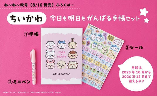『ねーねー』限定ふろくは…! 「ちいかわ」のみりょくが大ばくはつ! 「今日も明日もがんばる手帳セット」が登場だよ。オールカラーの手帳には、2026年12月までのカレンダー+いろいろ書けるメモページもいっぱい。草むしり検定風のプロフィールページまで♪ もちろん、キュートなイラストが全ページにのってるよ。手帳にぴったりのピンクのミニポールペンもかわいさMAX~! 小さいから持ち運びにも便利だね。シールにも、ちいかわたちのお顔がたくさん! 予定にあわせて手帳のページをデコってね。今回もボリュームたっぷりのふろくを楽しんで☆