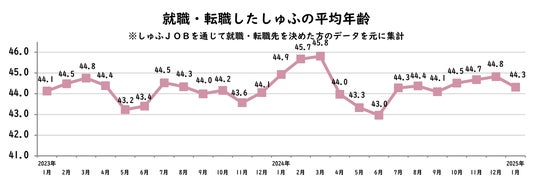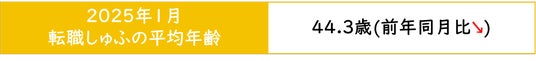 転職しゅふの平均年齢は、前月比-0.5歳、前年同月比-0.6歳の44.3歳。
