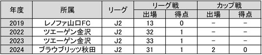 聖隷JFC - ジュビロ磐田U-18 - 流通経済大学 - 流経大ドラゴンズ龍ヶ崎 - レノファ山口FC - UDオリヴェイレンセ(ポルトガル) - ツエーゲン金沢 - ブラウブリッツ秋田(期限付き) - ツエーゲン金沢
