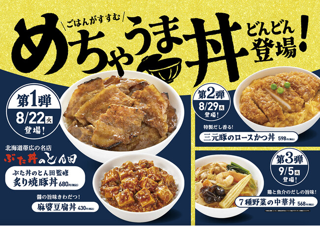 第1弾では、北海道の帯広で人気の名店「ぶた丼のとん田」監修の「炙り焼豚丼」と、醤のコク深い旨味がきわだつ「麻婆豆腐丼」を発売します。