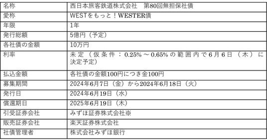西日本旅客鉄道株式会社(代表取締役社長:長谷川一明、以下「当社」)は、2024年6月19日に、みずほフィナンシャルグループが提供するデジタルエンゲージメントプラットフォーム(以下「本プラットフォーム」)を活用した、鉄道事業者として初となる個人向けデジタル特典付き社債(愛称:WESTをもっと!WESTER債、以下「本社債」)の発行を予定しておりますのでお知らせいたします。