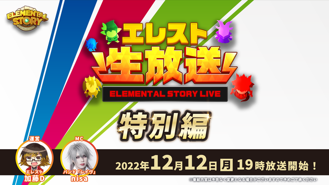 StudioZ株式会社(本社:東京都港区 代表取締役CEO:池幡 賢)が運営しております 共闘対戦 爽快パズル消しゲー『エレメンタルストーリー』は、2022年12月12日(月)19:00より、StudioZ公式エレスト生放送-特別編-を配信いたします。12月15日(木)から開催する冬の大感謝祭など、エレストの最新情報をお届けします。