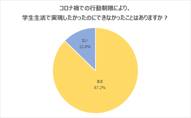 「コロナ禍の行動制限により、学生生活で実現したかったのにできなかったことがある」と回答した学生が87.2%に上りました。約9割の学生は、行動制限により実現できなかったことがあることが分かります。