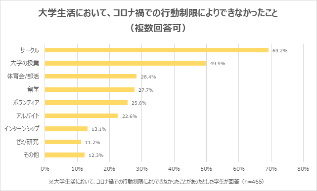 コロナ禍の行動制限によりできなかったことは、「サークル」が69.2%で最多。次いで、「大学の授業」49.9%、「体育会/部活」28.4%、「留学」27.7%が続きました。