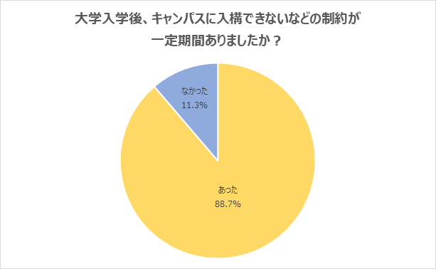 大学入学後、キャンパスに入構できないなどの制約が一定期間あったと回答した学生が88.7%に上りました。約9割に迫る学生が、コロナ禍の行動制限などにより一定の制約を受けていたことが分かります。