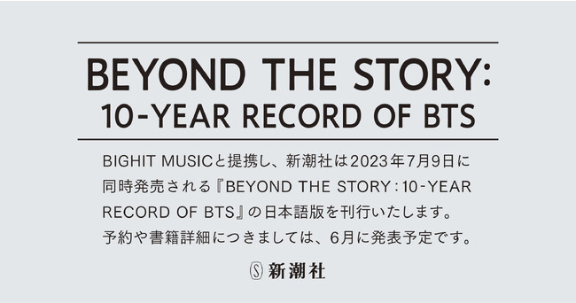 BIGHIT MUSICと提携し、新潮社は2023年7月9日に同時発売される『BEYOND THE STORY : 10-YEAR RECORD OF BTS』の日本語版を刊行いたします。予約や書籍詳細につきましては、6月に発表予定です。