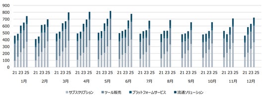 サブスクリプションは、CLIP STUDIO PAINT サブスクリプション売上です。ツール販売には、一括支払いモデルのダウンロード版や法人向けライセンスの売上などが含まれます。プラットフォームサービスには、CLIP STUDIO WEBサービスでの売上等が含まれます。流通ソリューションには、電子書籍及びDC3に関連する売上が含まれます。