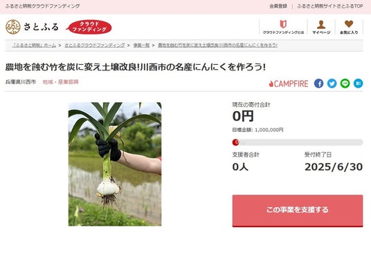 兵庫県川西市ふるさと納税ポータルサイト「さとふる」を運営する株式会社さとふる(本社:東京都中央区、代表取締役社長 兼 CEO:藤井 宏明)は、「さとふるクラウドファンディング」にて、「農地を蝕む竹を炭に変え土壌改良!川西市の名産にんにくを作ろう!」の寄付受け付けを2025年3月26日より開始します。