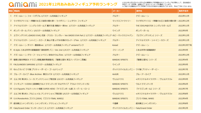 大網株式会社(東京都文京区)は、自社が運営するホビーショップ『あみあみ』の2021年12月フィギュア予約ランキングを発表いたしました。